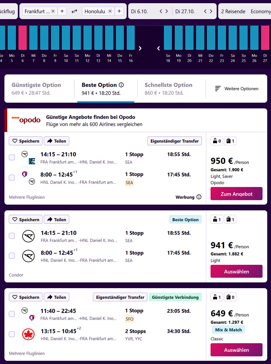 Wenn Sie einen Urlaub in Hawaii planen, ist der Flug dorthin ein wesentlicher Faktor. Sie sollten einmal im Internet bei Google einfach eine Flugbuchung eingeben, wie z.B. "Flug Frankfurt - Honolulu". Als Zeitpunkt wählen Sie beispielsweise den 6.10..2026 bis 27.10. 2026, das sind 3 Wochen. Dann bekommen Sie die günstigsten Angebote für diesen Zeitraum. Es melden sich Vergleichsportale wie SwooDoo oder Opodo, Expedia oder auch der Google-Dienst direkt. Die Preise (Stand: Febr. 2026) liegen etwa zwischen 650 und 1050 € je nach Anbieter und Fluggesellschaft. Sie können auch eine Flugsuchmaschine wie Momondo benutzen, die Ihnen relativ genau die Daten der einzelnen Flüge anzeigt. Der Vorteil bei dieser Suchmaschine liegt darin, dass nicht nur die günstigste oder optimale Flugverbindung angezeigt wird, sondern auch die Details über die Fluggesellschaften und Zwischenlandungen dazu angeklickt werden können.