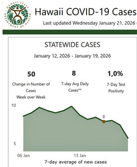Auf der rechten Seite sehen Sie die aktuelle Tabelle vom 19. Januar 2026 in Hawaii. Bei 50 Infektionen pro Woche Tag kann man sicher nicht davon sprechen, dass die Pandemie noch existiert, aber die Gefahr einer Ansteckung ist nicht vorbei.