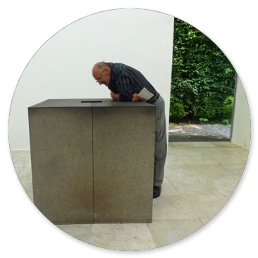 Unter Anleitung unseres Führers "begingen" wir anschließend die Skulptur und erkannten das geometrische und mathematische Baukonzept, das ihr zugrunde liegt. Peter Wunderlich demonstrierte es in einer Ecke und wurde immer schlanker.