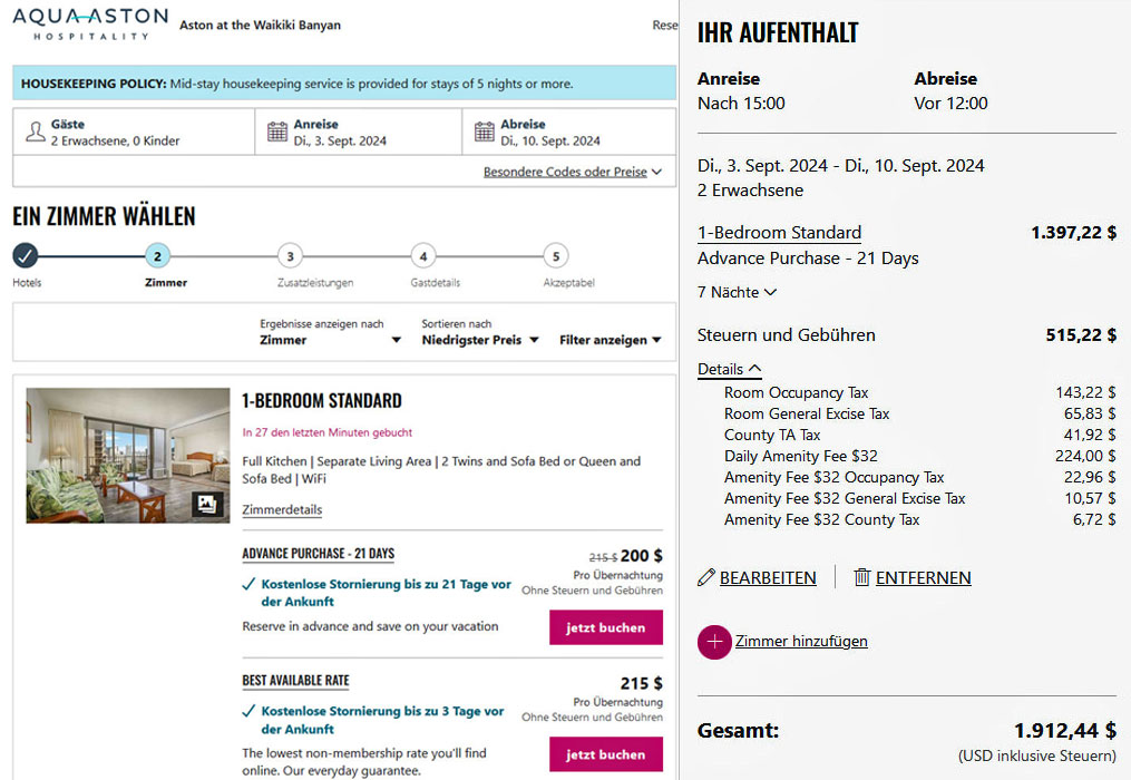 Für die Woche vom 3.9. bis 10.9. 2024 kommt dann zum Beispiel bei einem Übernachtungspreis von 200 Dollar ein Gesamtpreis von 1912,44 $ heraus: