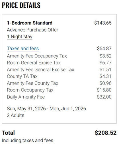 Tipp 2: Es kommt allerdings noch ein wichtiger Unterschied hinzu: Die Preise verstehen sich ohne Steuer und Resort Fee. Diese beiden Beträge müssen Sie bei allen Hotels hinzurechnen. Ich habe einmal probeweise für den 31.Mai 2026 gebucht und den nebenstehenden Gesamtpreis erhalten. Da sind aus den 143 Dollar schnell 208 Dollar geworden. Und 30 Dollar muss man noch täglich für das Parkhaus bezahlen.
