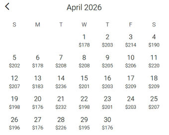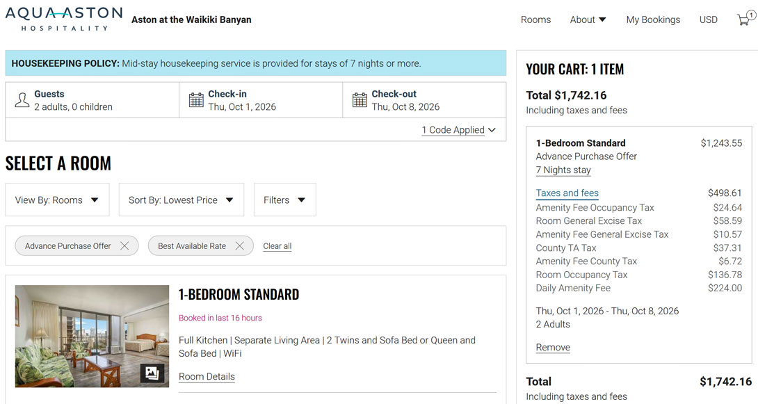 Zimmerpreise für eine Standardsuite im Aston Waikiki Banyan im Zeitraum von April bis Dezember 2026