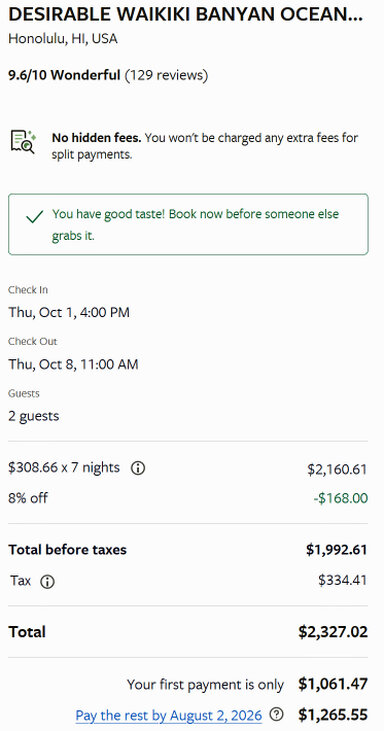 Wenn ich nun beispielsweise eine Buchung vom 1.10. bis 8.10. 2026 durchführe, stelle ich fest, dass ich auf einen Preis von 1951 $ für eine Woche komme. Das sind nach dem derzeitigen Umrechnungspreis (Januar 2026) 1646 €. Weiterhin werde ich noch darauf hingewiesen, dass ich ersetzen muss, wenn ich etwas kaputt mache. Positiv ist aber auch, dass ich nur 1,061.47 $ anzahlen muss und den Rest erst 6 Wochen vor Ankunft. Stornieren kann man ebenfalls kostenlos bis zu diesem Zeitpunkt. Die Servicegebühr ist aber in jedem Fall futsch und wird von VRBO kassiert.
