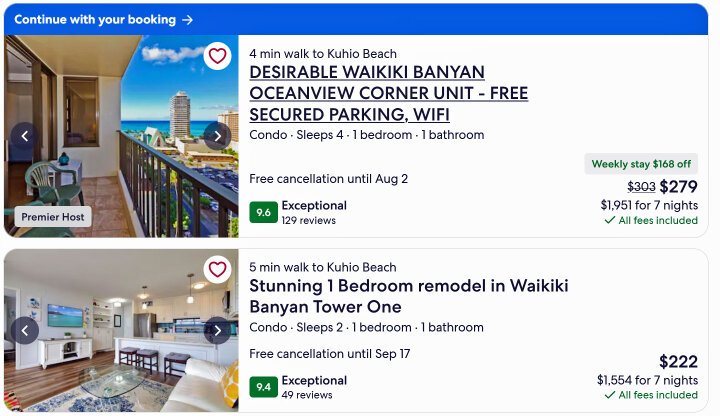 Viel interessanter ist deshalb die Website von VRBO (= Vacation Rentals By Owner). Das war bis vor wenigen Jahren noch ein Geheimtipp, gehört aber jetzt zu Expedia. Der große Konkurrent ist Airbnb mit Ferienwohnungen.de und bietet diese Wohnungne auch an. Das hat zwar den Nachteil, dass man auch noch eine Vermittlungsgebühr bezahlen muss, aber man bekommt im Gegensatz zu den anderen Firmen einen genauen Überblick über das Apartment oder Condo, das man buchen will. Das ist nämlich bei den oben genannten Fällen nicht so, weil man dort nur allgemeine Zimmerangaben des bestimmten Hotels und nicht einer speziellen Wohnung erhält. Nun ist auch bei diesem Anbieter auch nicht auszuschließen, dass gesponserte Angebote an den Anfang gestellt werden, aber Sie haben immerhin die Möglichkeit, einen Filter für die günstigsten Angebote zu wählen. Hier werden jetzt aber die Zimmer oder Suiten mit der exakten Nummer und Lage dargestellt. Es werden vor allem viele Bilder präsentiert, die von den Eigentümern selbst stammen. Die Vermittlungspauschale wird übrigens sowohl vom Vermieter wie auch vom Mieter eingezogen. Davon lebt VRBO ausgezeichnet, macht aber eben auch dafür die weltweite Vermarktung und wickelt das finanzielle Geschäft ab. Das ist schon ähnlich raffiniert gestaltet wie bei Ebay, denn Sie können dem Vermieter keine direkte Mail schicken, sondern die Anfrage geht immer zuerst zu VRBO und wird von dort zum Vermieter weitergeleitet.Wenn man das Datum für An- und Abreise, die Zahl der Personen und die Reihenfolge der Preiswünsche gewählt hat, erscheinen sofort zig Wohnungen, die in dem Aston Waikiki Banyan Block. von Privatanbietern oder von Maklern angeboten werden.