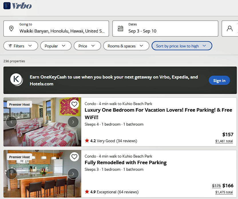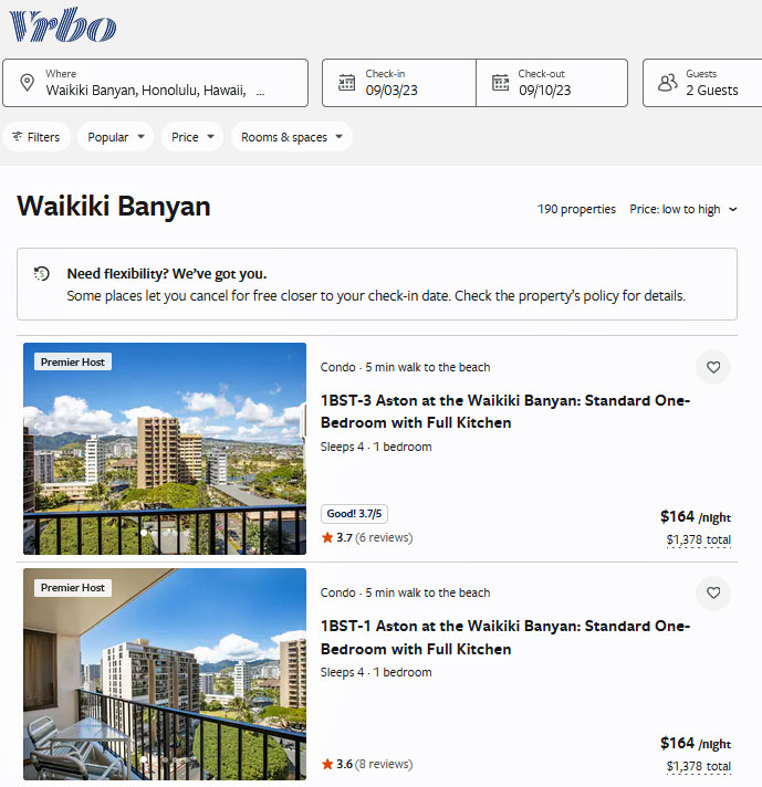 Viel interessanter ist deshalb die Website von VRBO (= Vacation Rentals By Owner). Das war bis vor wenigen Jahren noch ein Geheimtipp, gehört aber jetzt zu Expedia wie auch Airbnb oder Ferienwohnungen.de. Das hat zwar den Nachteil, dass man auch noch eine Vermittlungsgebühr bezahlen muss, aber man bekommt im Gegensatz zu den anderen Firmen einen genauen Überblick über das Apartment oder Condo, das man buchen will. Das ist nämlich bei den oben genannten Fällen nicht so, weil man dort nur allgemeine Zimmerangaben des bestimmten Hotels und nicht einer speziellen Wohnung erhält. Nun ist auch bei diesem Anbieter auch nicht auszuschließen, dass gesponserte Angebote an den Anfang gestellt werden, aber Sie haben immerhin die Möglichkeit, einen Filter für die günstigsten Angebote zu wählen. Hier werden jetzt aber die Zimmer oder Suiten mit der exakten Nummer und Lage dargestellt. Es werden vor allem viele Bilder präsentiert, die von den Eigentümern selbst stammen. Die Vermittlungspauschale wird übrigens sowohl vom Vermieter wie auch vom Mieter eingezogen. Davon lebt VRBO ausgezeichnet, macht aber eben auch dafür die weltweite Vermarktung und wickelt das finanzielle Geschäft ab. Das ist schon ähnlich raffiniert gestaltet wie bei Ebay, denn Sie können dem Vermieter keine direkte Mail schicken, sondern die Anfrage geht immer zuerst zu VRBO und wird von dort zum Vermieter weitergeleitet.Wenn man das Datum für An- und Abreise, die Zahl der Personen und die Reihenfolge der Preiswünsche gewählt hat, erscheinen sofort zig Wohnungen, die in dem Aston Waikiki Banyan Block. von Privatanbietern oder von Maklern angeboten werden.