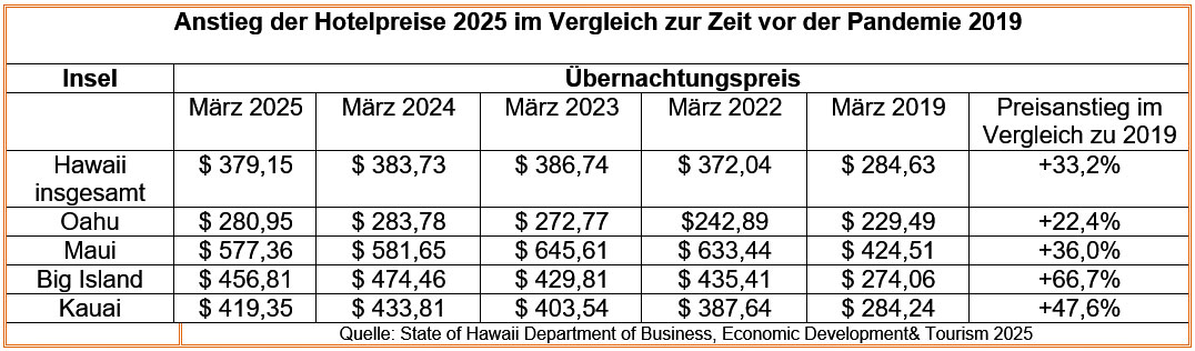 Obwohl die Preise für 2025 in einigen Bereichen stabil geblieben sind, sind sie besonders auf den anderen Inseln kräftig gestiegen. Hier die aktuelle Zusammenstellung des hawaiianischen Touristenbüros vom März 2025: